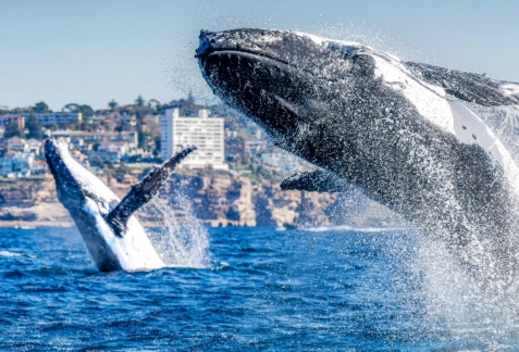 【出海观鲸】(游览约 90 分钟)想要体验大自然的震撼力量吗?来悉尼,登上一艘豪华游轮,迎着清新的海风,出海去寻找海洋中的巨星一一鲸鱼;这里的蔚蓝广袤不仅是画布,更是鲸鱼跃动的舞台,在这里,你将会有一场近距离的奇妙邂逅;随着船只的启航,城市的喧嚣开始渐渐远去,高楼大厦变成了海平线上的剪影;你的心跳随着浪花的节拍开始加速,因为你知道,即将遇见的是自然界的宏伟与温柔的完美结合;